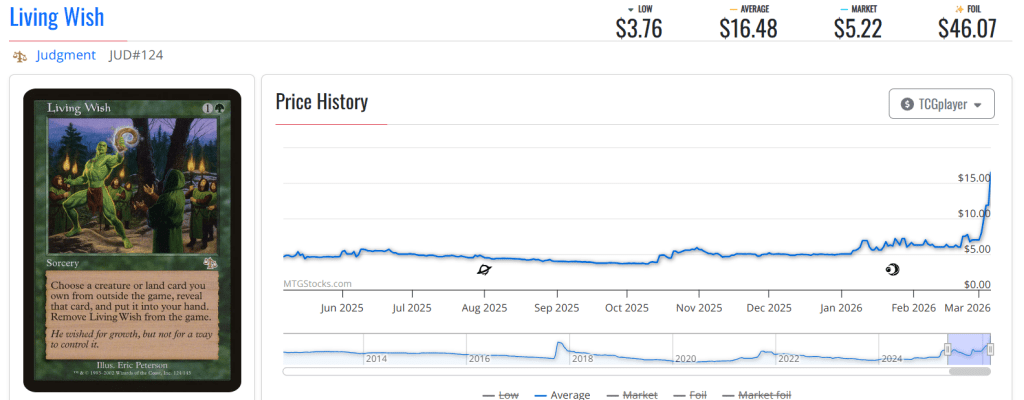 The caveat here is that Premodern players overwhelmingly go for the original printings (even though the format does allow you to use reprints), and Living Wishโs spike has thus far only affected the Judgement original, and not the Masters 25 reprint.ย