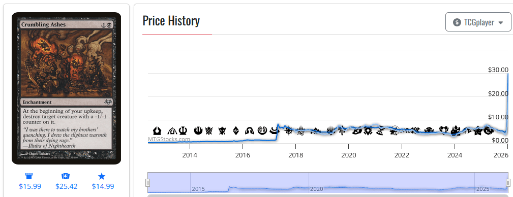 Just like Nest of Scarabs, the price spike of Crumbling Ashes can be attributed to Blight Curse. This Eventide enchantment also skipped out on a reprint in the precon, and only has its original printing.