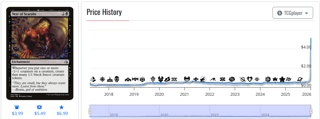 Nest of Scarabs has seen one of the sharpest spikes this week, jumping from less than a dollar to due to its importance to -1/-1 counters and the lack of a reprint in Blight Curse.