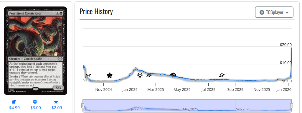 The -1/-1 counter synergies keep flowing with Persistent Constrictor, a powerful -1/-1 counter distributor from Duskmourn. Itโs seen a sharp spike from a dollar or two to nearly twenty.