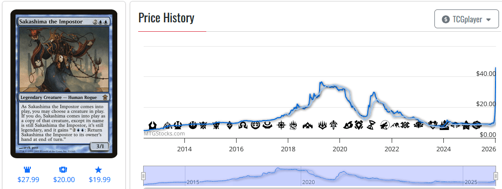 Perhaps the most puzzling jump this week was Sakashima the Impostor, leaping from $9-ish to a high of $45 dollars.