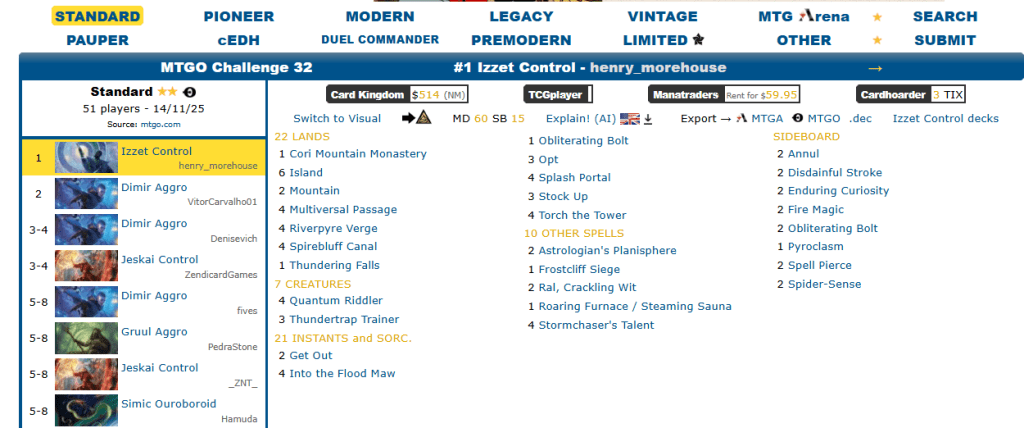 Izzet Control showed up right after the last weeks bans, almost reaching the Top 8 in the Standard MTGO Challenge 32 on Nov 11. And has been getting great results since then.