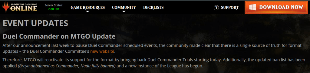 With two different communities claiming to represent and maintain the format, MTGO devs were in a bit of a pickle about which to follow for bans. What MTGO decided to do back then was to run a poll. Based on the poll's results, โthe community made clear that there is a single source of truth for format updates โ the Duel Commander Committeeโs new website,โ MTGO said.