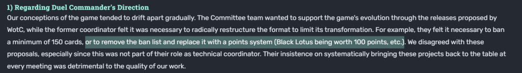 โฆ then there was a community schism. Long story short, the Duel Commander organizers split, along with their websites, and the โpoint systemโ was literally one of the causes for the split according to one of the sides: