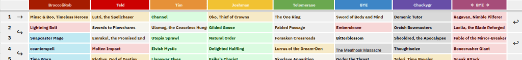 Hereโs an example of what happened in a real ROTO draft using a Cube with cards available on MTG Arena, drafted via spreadsheet. The whole cube was drafted, 450 cards, 10 players, 45 picks total. You can check the whole spreadsheet out here.