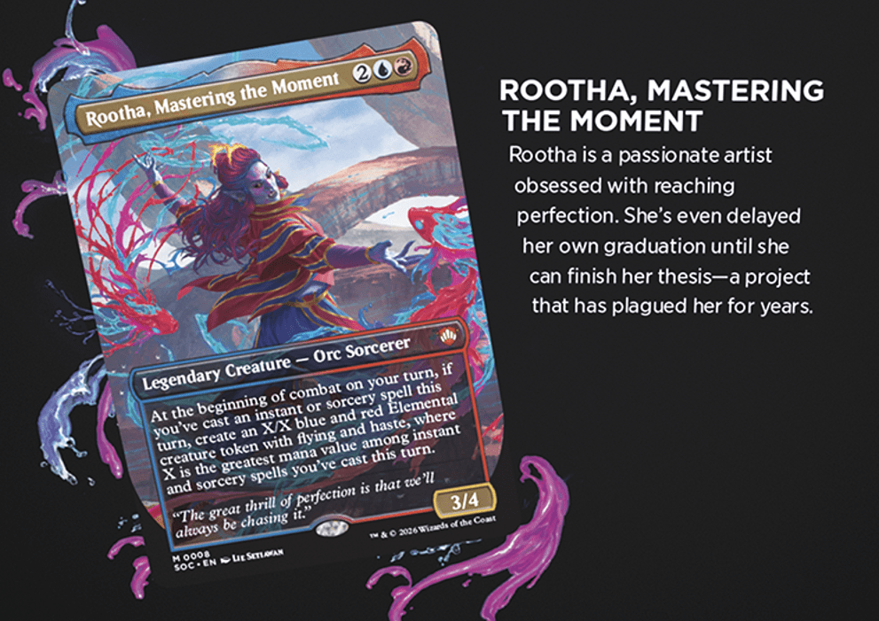 Rootha, Mastering the Moment looks respectable enough, it's just not all that inspired. That was sort of Prismari's problem in the original Strixhaven set: How do you make Izzet spellslinging feel unique on the plane where every color pair is known for spellslinging? The answer is you don't, and you just embrace what Izzet always does. In this case, Rootha makes one large token per turn and smashes face, incentivizing casting big spells. It's got extra turns written all over it, which is probably as much a net negative as it is a good thing.
