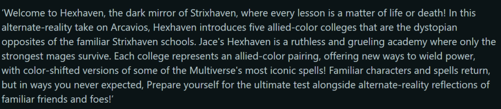 I haven't been able to track down the exact reddit post that first brought this up one year ago, but in the following months several posters referenced having seen a post discussing a Wizards marketing survey from November 2024, describing an alternate Arcavios / โHexhavenโ angle, with color-shifted versions of well-known characters.