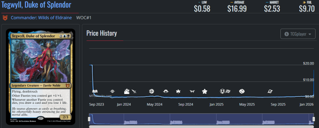 Tegwyll, Duke of Splendor has seen an immense 475% price spike this week, per MTGStocks. This price spike can be attributed to Lorwyn Eclipsed, which introduced a powerful new faerie commander, Maralen, Fae Ascendant along with additional faerie support like Bitterbloom Bearer and Voracious Tome-Skimmer.