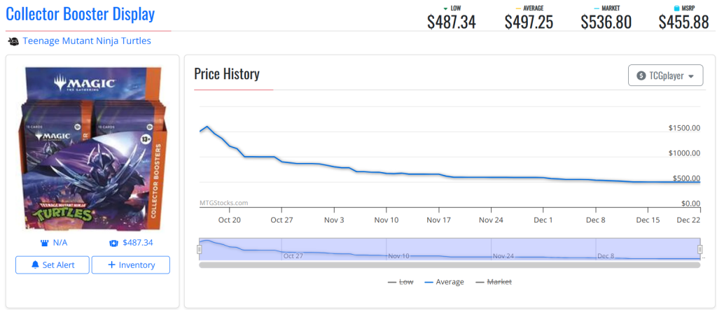 According to MTGStocks, Teenage Mutant Ninja Turtles Collector Booster Displays are currently at about $500. They were listed for three times as much in late October.