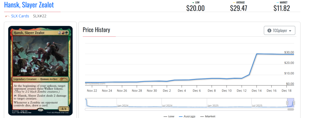 Opening this week's somewhat dubious spikes, prices listed on the US market for near-mint copies of Hansk, Slayer Zealot have gone up a bit less than $7 a week ago, to nearly thirty bucks.