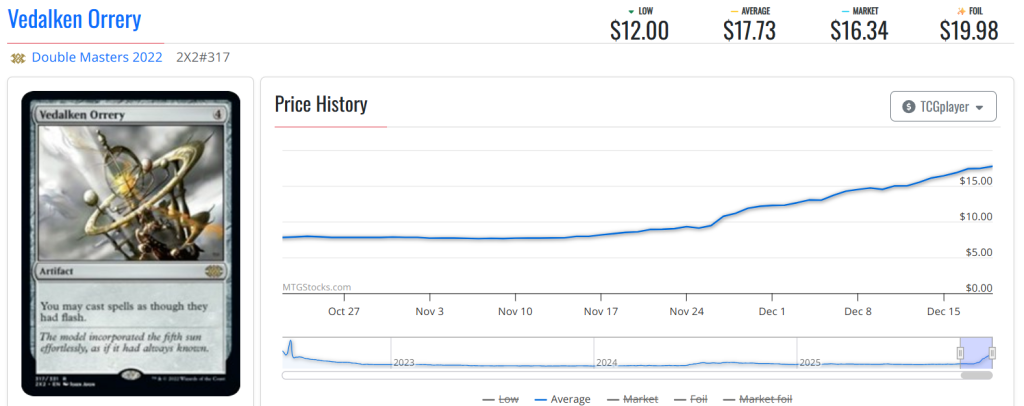 Like Galadhrim Ambush, Vedalken Orrery looks like the real deal. It's up by just a modest 20% since last week, but more than 100% since a month ago (where it was priced at around $8), and looks to be going up steadily.
